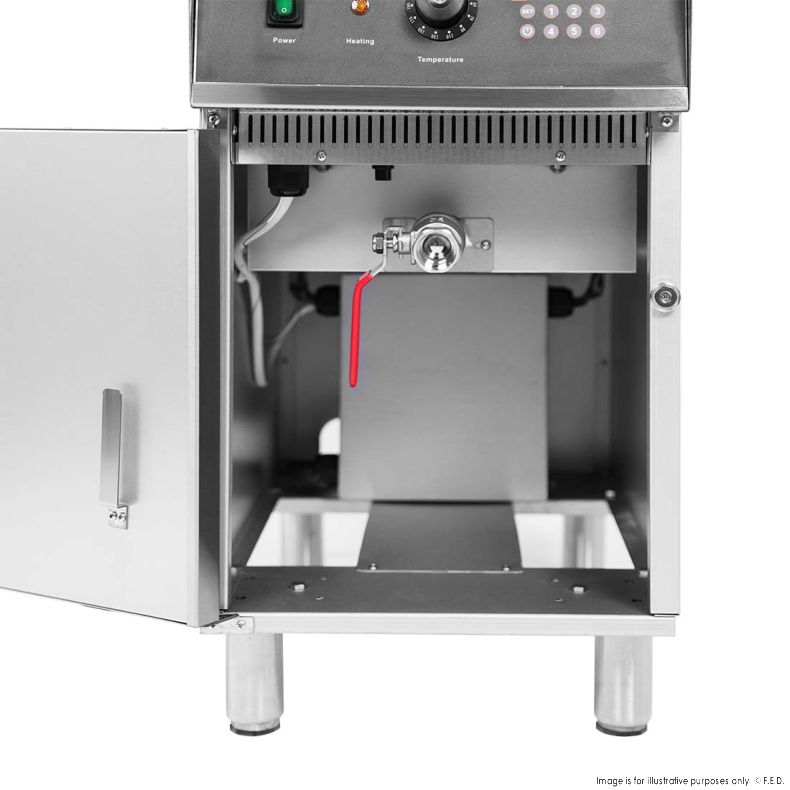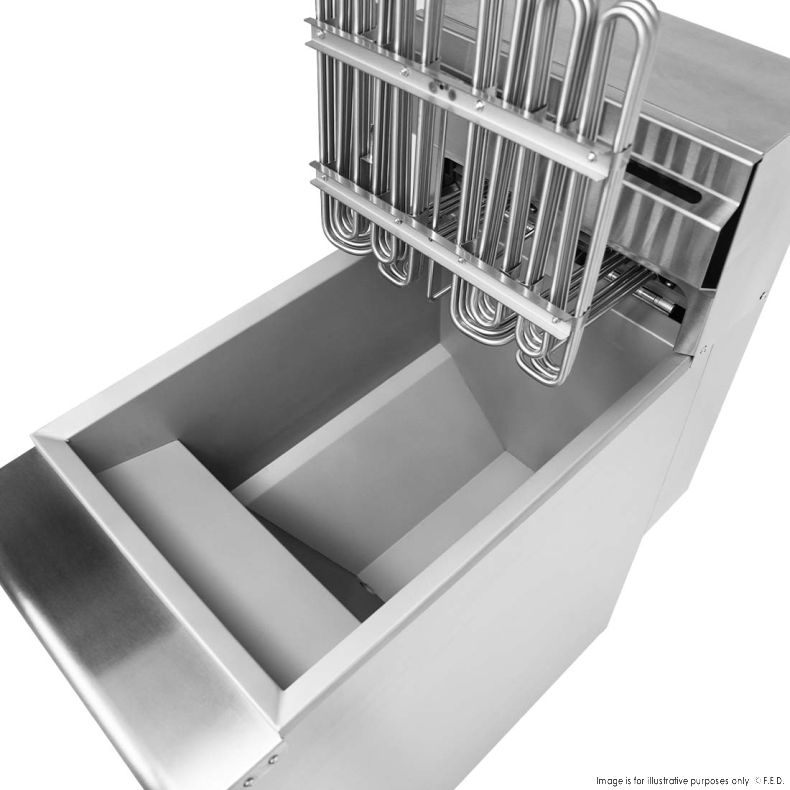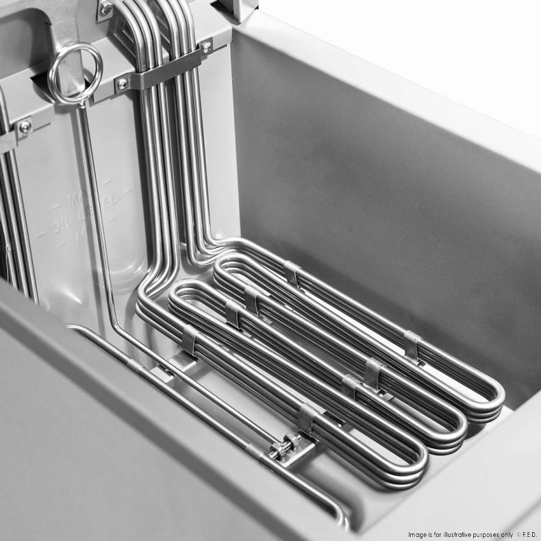 Electric fryers heat oil using immersed heating elements (tubes) powered by electricity. These elements warm the oil quickly and evenly, allowing consistent frying. Benefits: precise temperature control, fast recovery, and safer operation with fewer fuel-storage concerns.