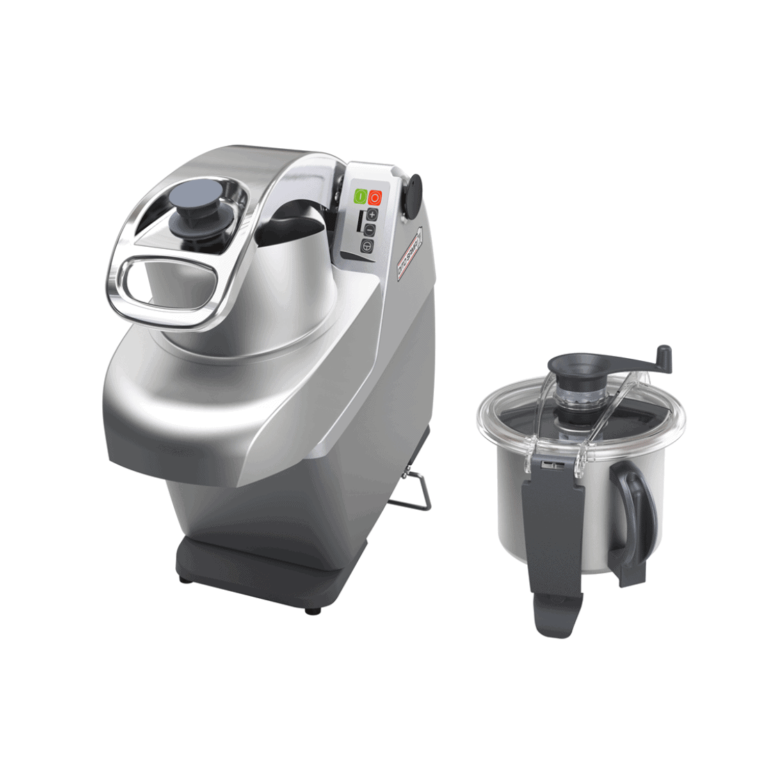 - Delivered with: [-] Stainless steel lever operated feed hopper [-] 4,5 lt stainless steel cutter bowl, transparent lid, scraper and micro-toothed blade rotor