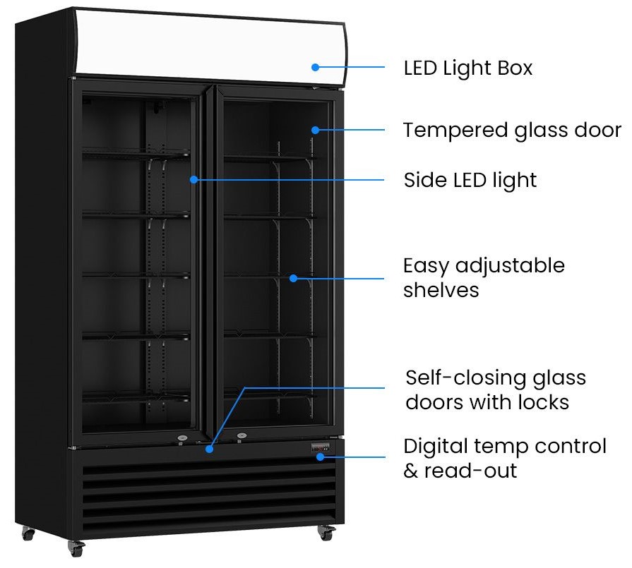 This stylish and immaculately designed Colourbond drink fridge includes two layered tempered glass doors, high cooling efficiency, low energy consumption, an illuminated canopy, lighting, adjustable shelves, castors, automatic defrost and condensate evaporation all included in one perfected unit.