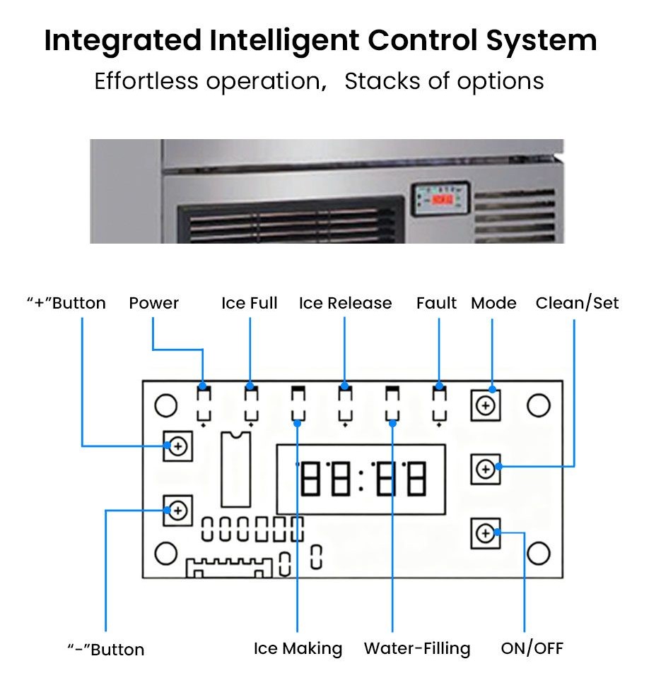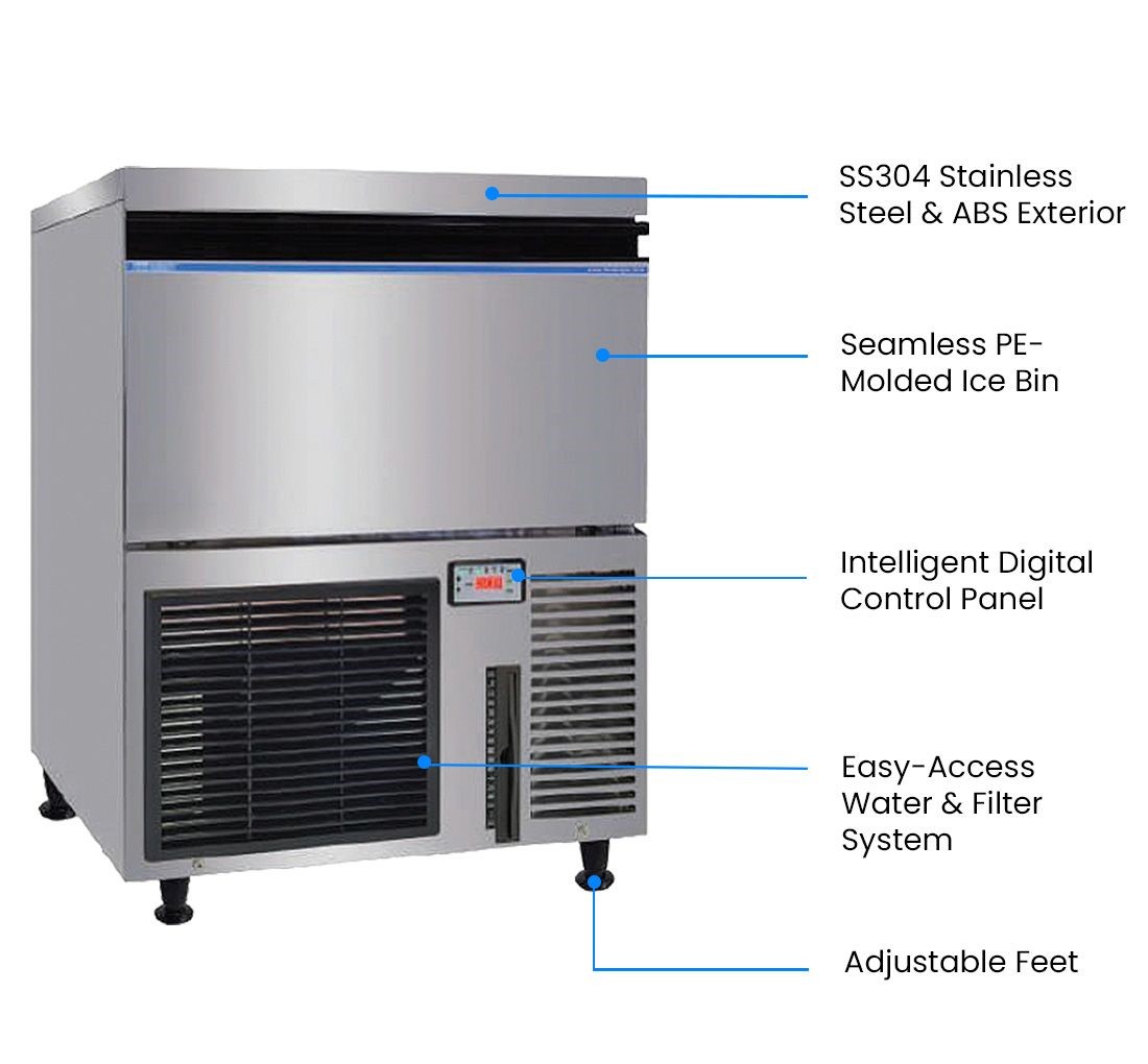 The SN-200P Premium Under-Counter Ice Maker is purpose-built for high-end hospitality venues requiring slow-melting, crystal-clear ice for premium beverage service. Using advanced spray technology, it produces large 48×48×58mm cubes with a core temperature of -17°C, ensuring clarity, density, and extended chill times—ideal for whiskey, cocktails, and upscale drinks. Designed to perform in tropical conditions up to +43°C, it combines durable SS304 stainless steel with ABS construction, automated cleaning, and intelligent controls, all in a compact under-counter design that saves space while delivering reliability and efficiency.