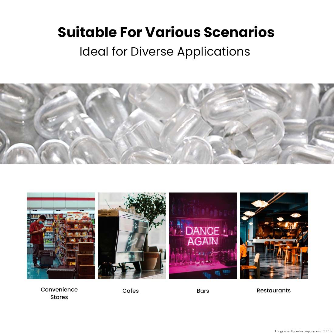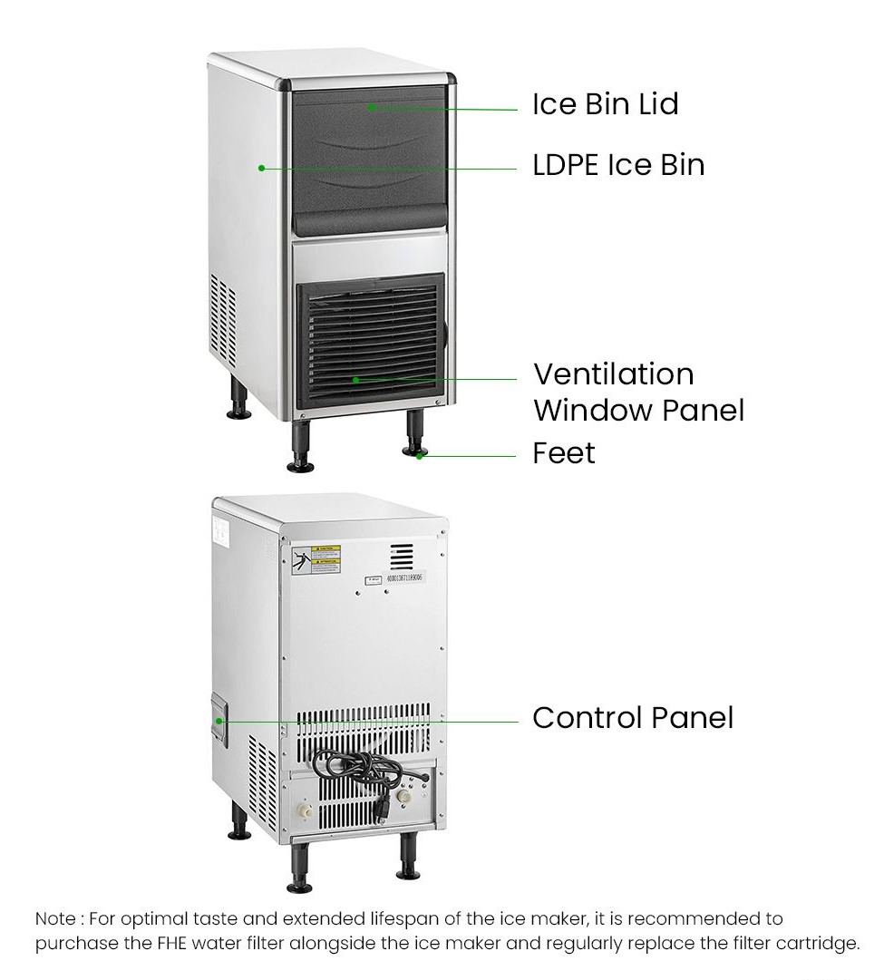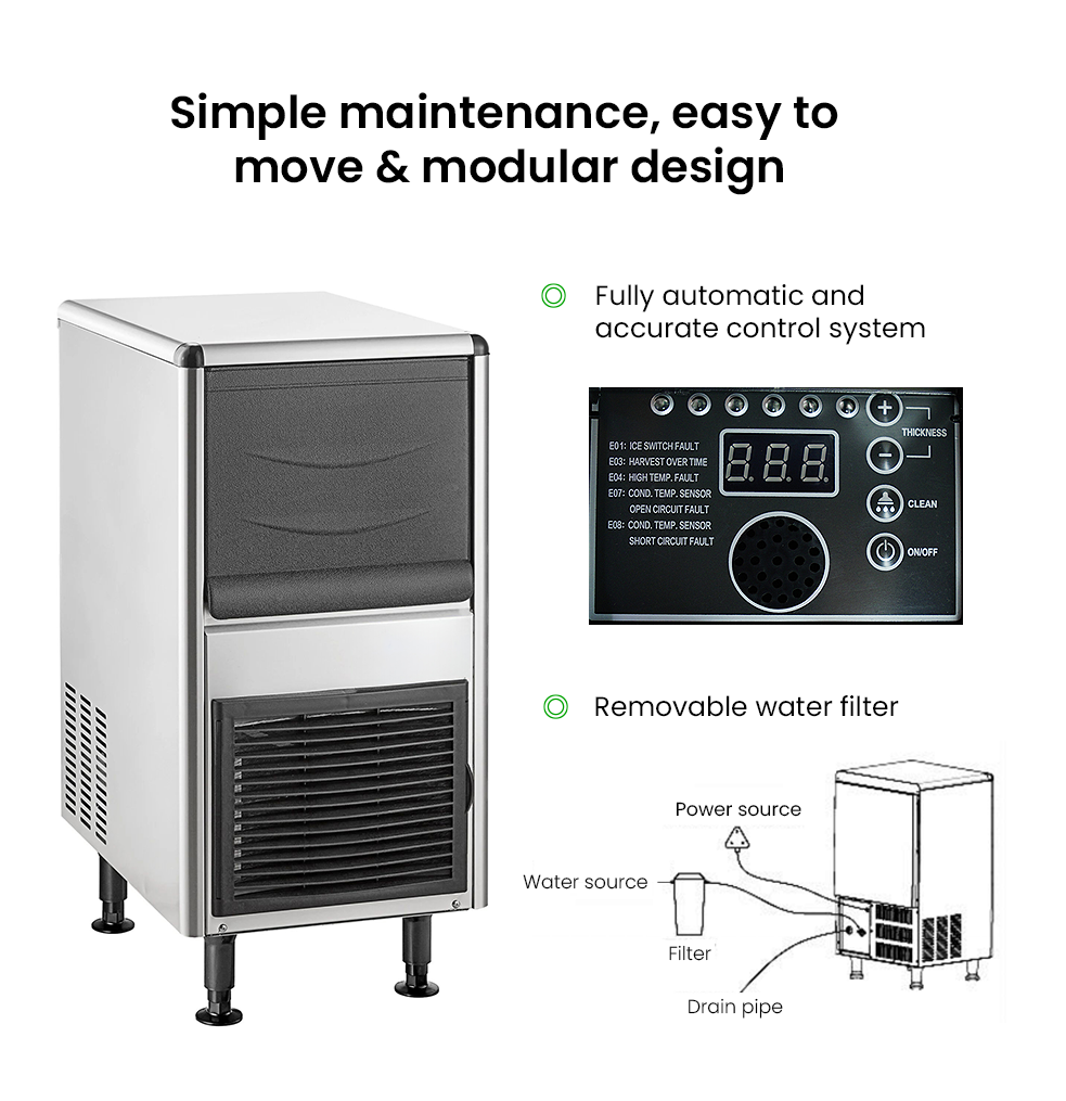 Its special spray-type evaporator boosts ice clarity and hardness, while the internal bin stores approximately 9 kg (controlled to ~6 kg), with up to 15 kg total holding capacity.