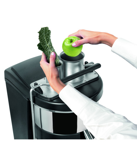 Centrifugal juicers are typically fast moving and have metal blades that spin against a mesh filter with speeds ranging between 1,000 RPM through to 30,000 RPM, which separates the juice via centrifugal force. These fast-moving blades can take on a whole apple or carrot without having to chop them into little pieces.