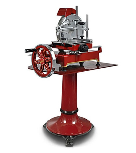 Constructed from aluminium and stainless steel, the Retro Flywheel slicer is a compact machine, specifically designed for use with all cold cut meats, particularly prosciutto. The chrome plated blade is constructed in quality steel alloy (100Cr6). It is hardened, tempered and resistant to rust.