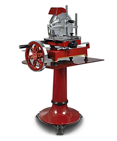 - Constructed from aluminium and stainless steel, the Retro Flywheel slicer is a compact machine, specifically designed for use with all cold cut meats, particularly prosciutto.