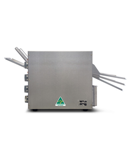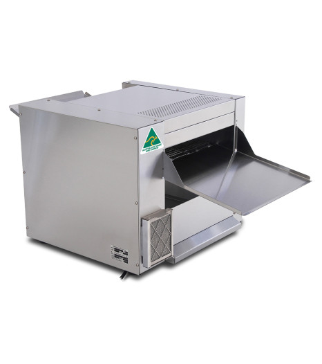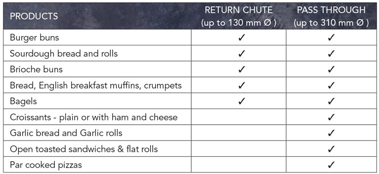 - Pass through: where the toasted product exits the machine at the rear using an exit chute. This is ideal where a snack item with toppings such as par cooked pizza or garlic bread is being produced. Three different angles for the exit chute ensure a solution to user requirements.