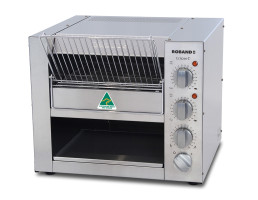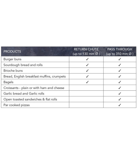 - Return chute operation: where the toasted product returns to the front of the machine. This is the most efficient set up as the rear of the machine is entirely closed providing good heat retention. Return chute operation is the best option for simple bun and bread toasting.