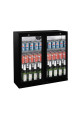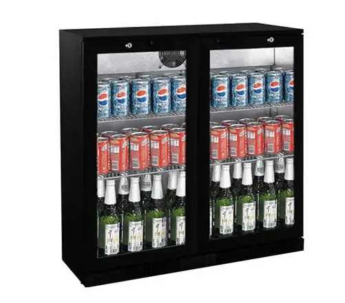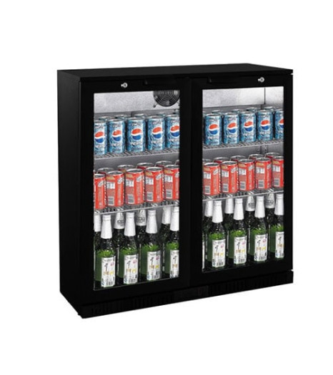 This 2 door under bar cooler… black epoxy polyester finished steel outer, features lockable double glazed self closing display doors. Auto defrost feature keeps bottle cooler working efficiently, interior display light means the fridge is ideal for presentation of bottles. This fridge is flexible, with two adjustable shelves to accommodate different height bottles and adjustable feet which mean the bottle cooler remains level on uneven bar floors.
