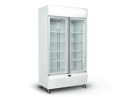 The unit has a top-mounted compressor. This allows the full height of the unit to be on display to the ground, perfect for supermarkets. It also allows the hot air from the condensing unit to be discharged upwards, allowing these to be placed next to each other and air to be ventilated from above to outside the store. This way an aisle of these can be created and no heat load enters the store.